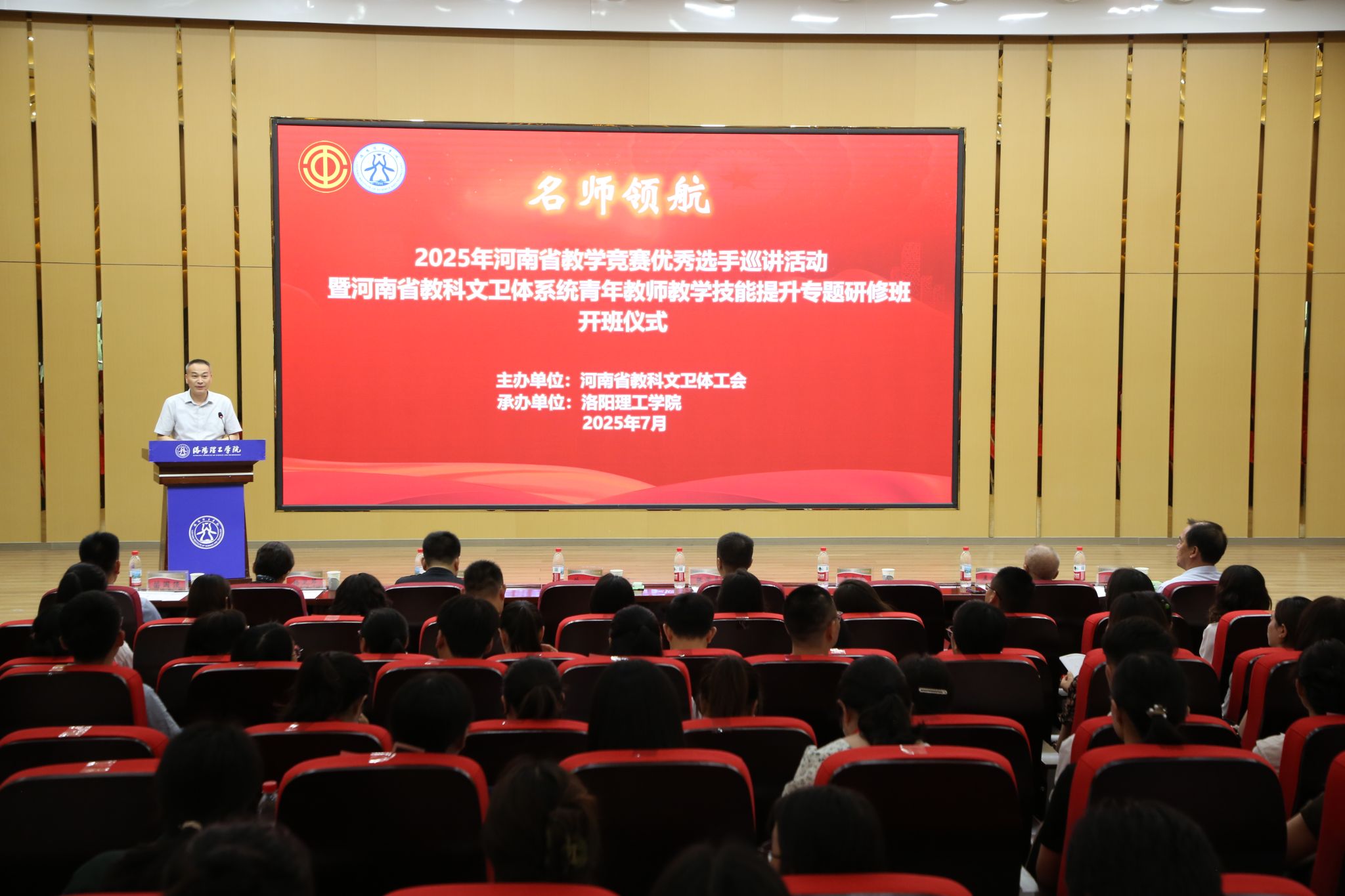 为深入学习贯彻党的二十大精神和习近平新时代中国特色社会主义思想,大力弘扬劳模精神、劳动精神、工匠精神,全面提升高等院校青年教师教学技能水平。7月1日,由河南省教科文卫体工会主办,我校承办的“名师领航”——2025年河南省教学竞赛优秀选手巡讲活动暨河南省教科文卫体系统青年教师教学技能提升专题研修班在我校开元校区图书馆报告厅举行,河南省教科文卫体工会主席张学勇,我校党委副书记、工会主席曾涛,副校长王新武出席开班仪式,来自全省高校的青年教师代表近300人参加开班仪式。仪式由王新武主持。