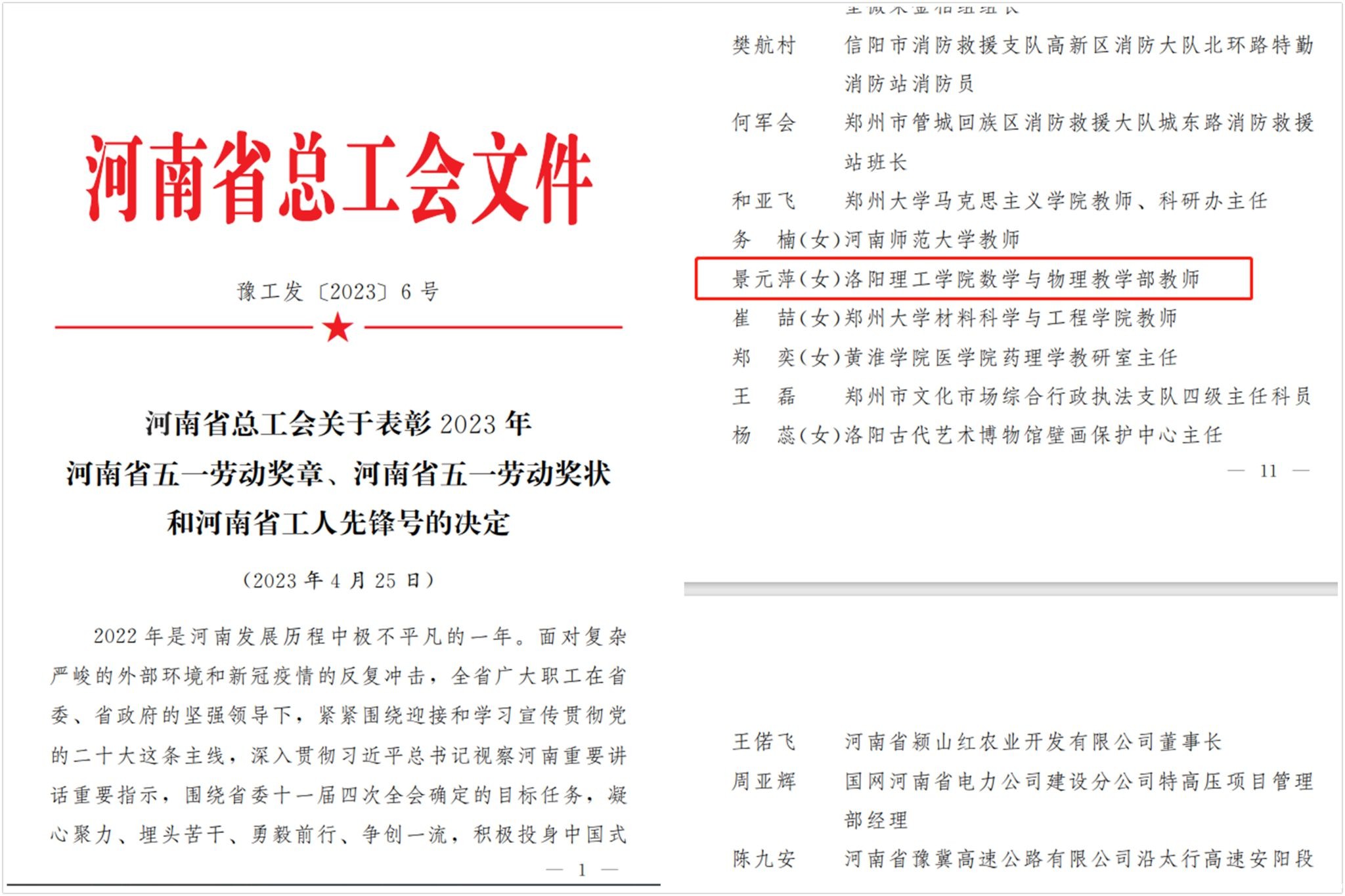 劳动最光荣,劳动最伟大。4月25日,河南省总工会下发《关于表彰2023年河南省五一劳动奖章、河南省五一劳动奖状和河南省工人先锋号的决定》,我校教师景元萍荣获“河南省五一劳动奖章”。