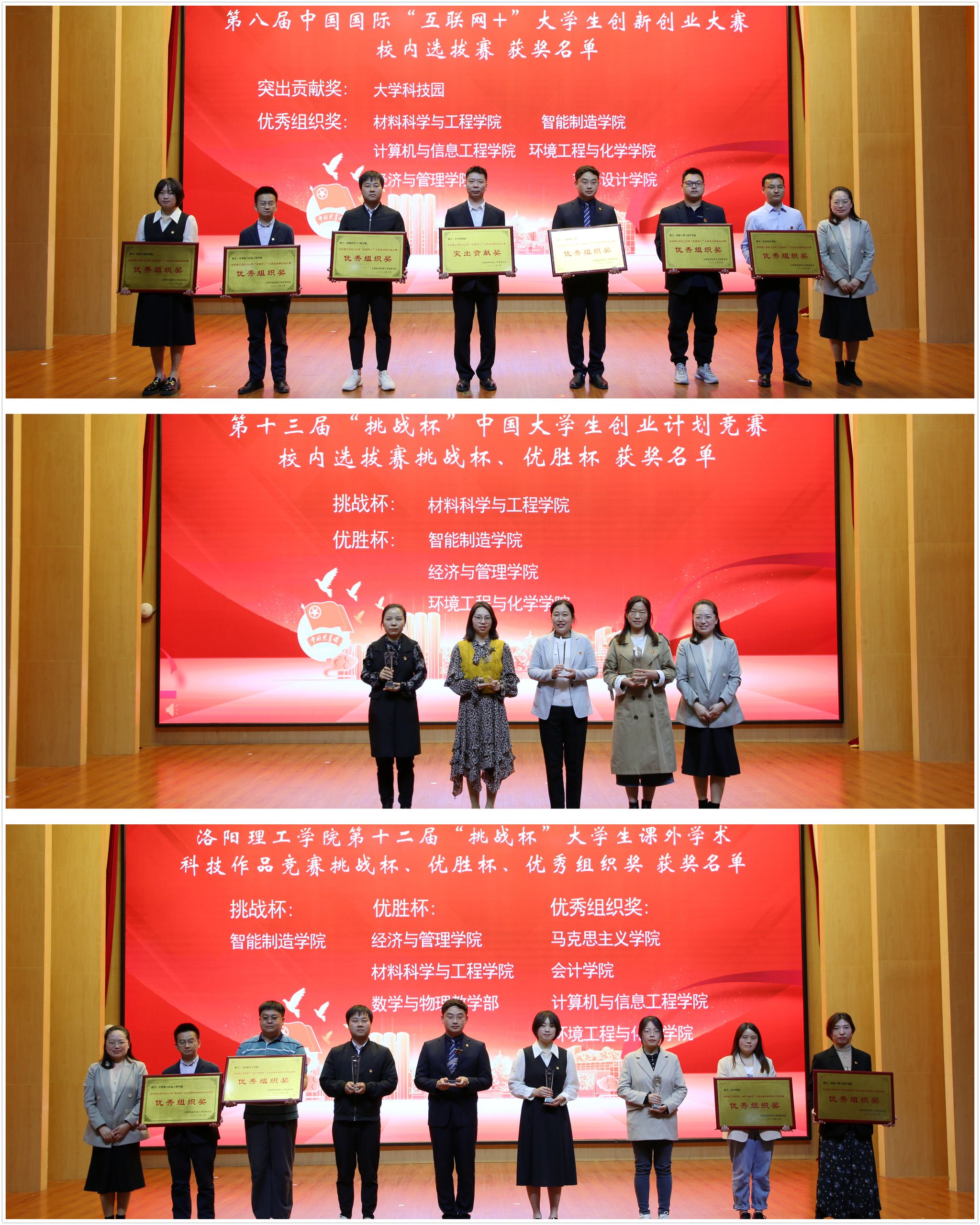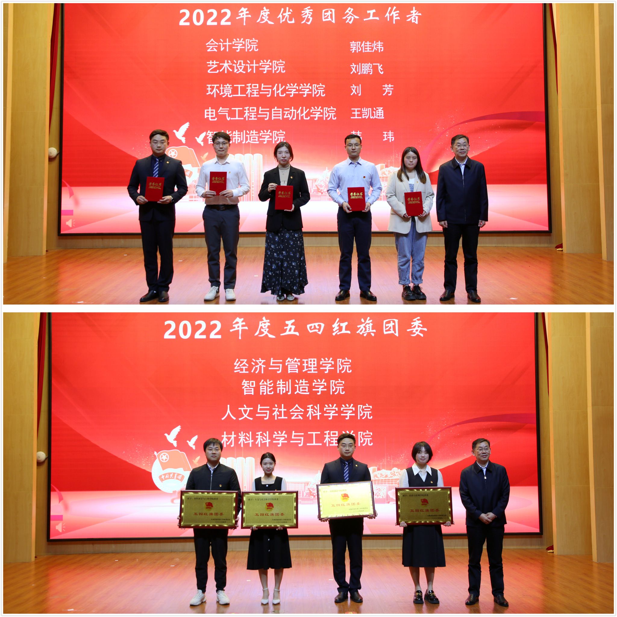 本次大会先后为学校2022年科技创新重要赛事(中国国际“互联网+”大学生创新创业大赛、“挑战杯”大学生课外学术科技作品竞赛、“挑战杯”中国大学生创业计划竞赛)校赛获奖集体颁奖;为2022年志愿服务项目大赛、雷锋活动月等志愿服务活动获奖集体和个人颁奖;对一年来全校共青团工作中涌现的先进集体、优秀个人进行了表彰。大会共表彰“优秀团员”1003名、“模范团干部”354名、“五四红旗团支部”75个。经济与管理学院团委、智能制造学院团委、人文与社会科学学院团委、材料科学与工程学院团委荣获“五四红旗团委”称号;郭佳炜、刘鹏飞、刘芳、王凯通、韩玮五名教师荣获“优秀团务工作者”称号。
