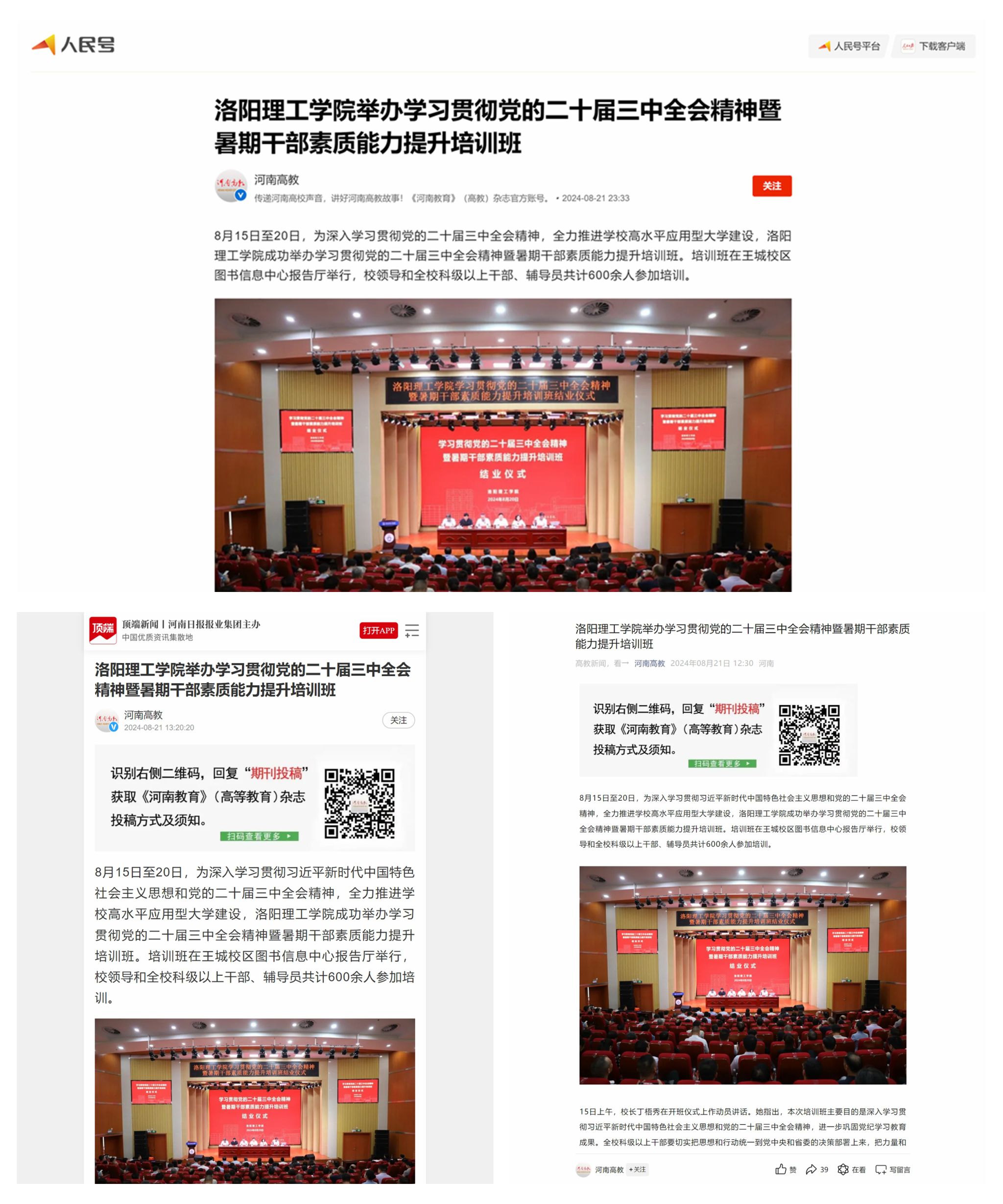 《河南高教》人民号、顶端号、微信公众号于8月21日分别报道我校举办学习贯彻党的二十届三中全会精神暨暑期干部素质能力提升培训班