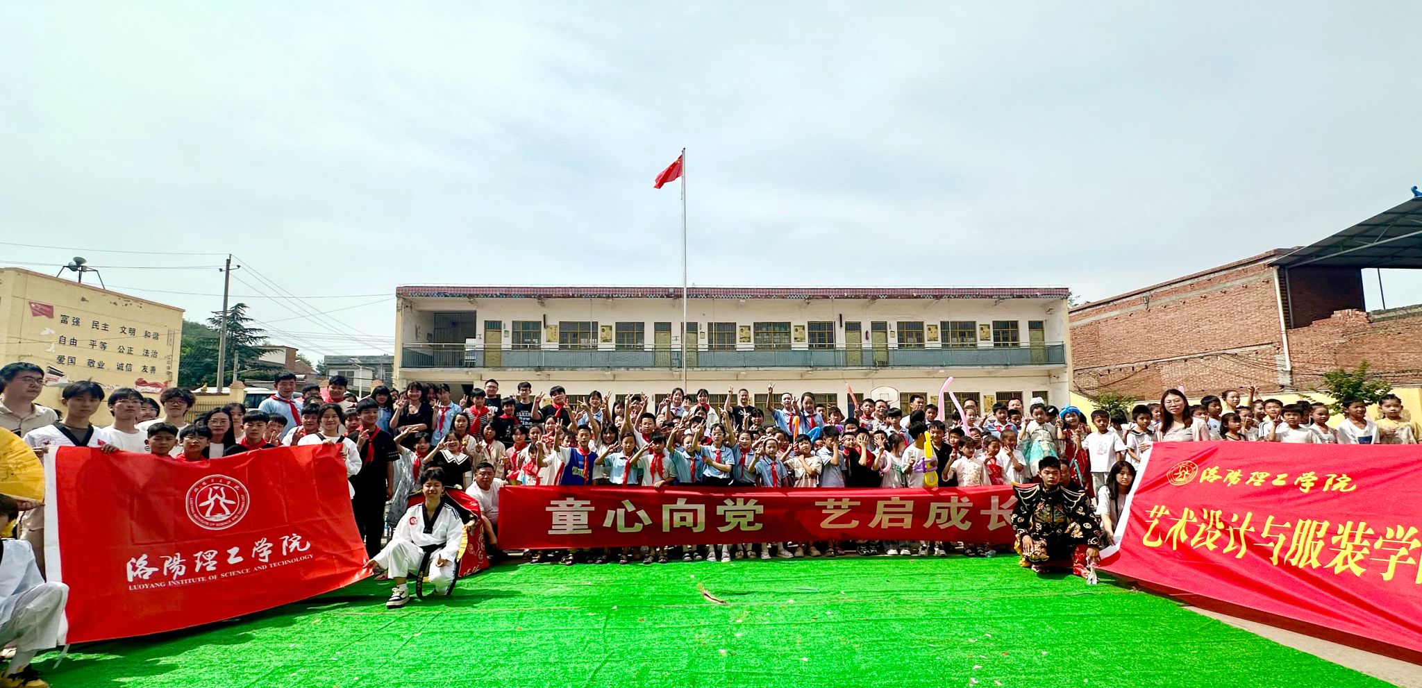 在六一国际儿童节来临之际,5月30日,校团委、艺术设计与服装学院、青年志愿者约50名师生赴学校定点帮扶的宜阳县白杨镇石垛村石垛小学开展“童心向党,艺启成长”庆“六一”系列活动,通过理论宣讲、文艺演出、民俗体验、艺术教育等方式为小朋友送去祝福和慰问。