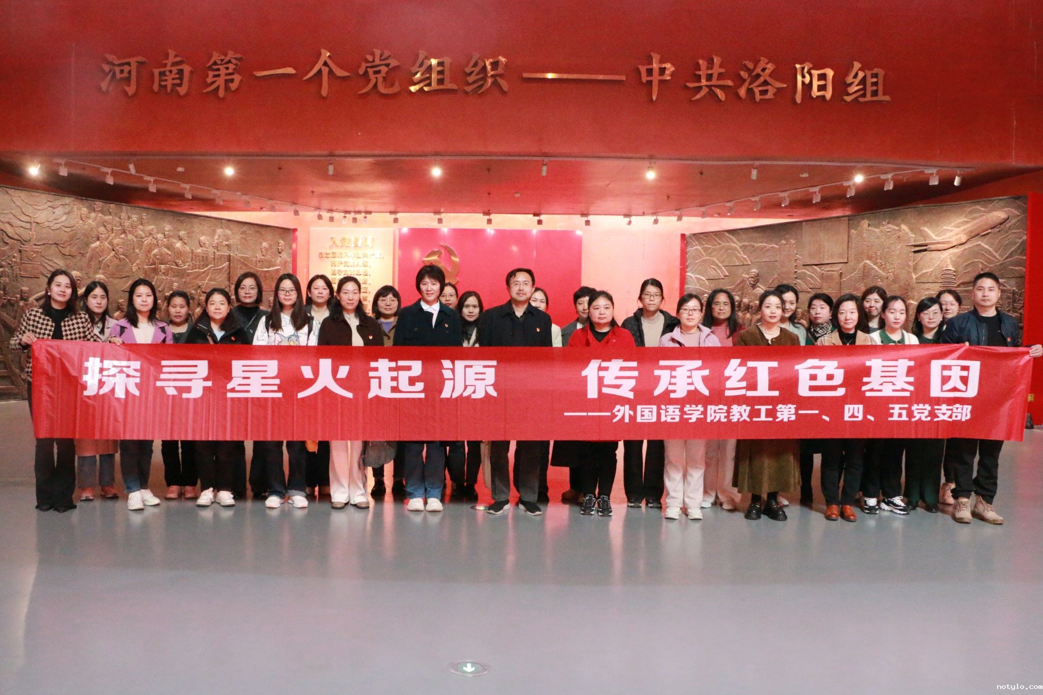 为深入学习贯彻落实党的二十大精神,强化共产党员使命担当,教育引导广大党员自觉用习近平新时代中国特色社会主义思想武装头脑,学习党的光辉历程,感悟党的初心使命,传承党的红色基因,3月12日,外国语学院教工第一、四、五党支部全体党员赴河南省爱国主义教育基地——中共洛阳组诞生地纪念馆开展了“探寻星火起源,传承红色基因”主题党日活动,共同探寻中原星火起源,接受红色教育洗礼,感悟共产党人的初心使命。