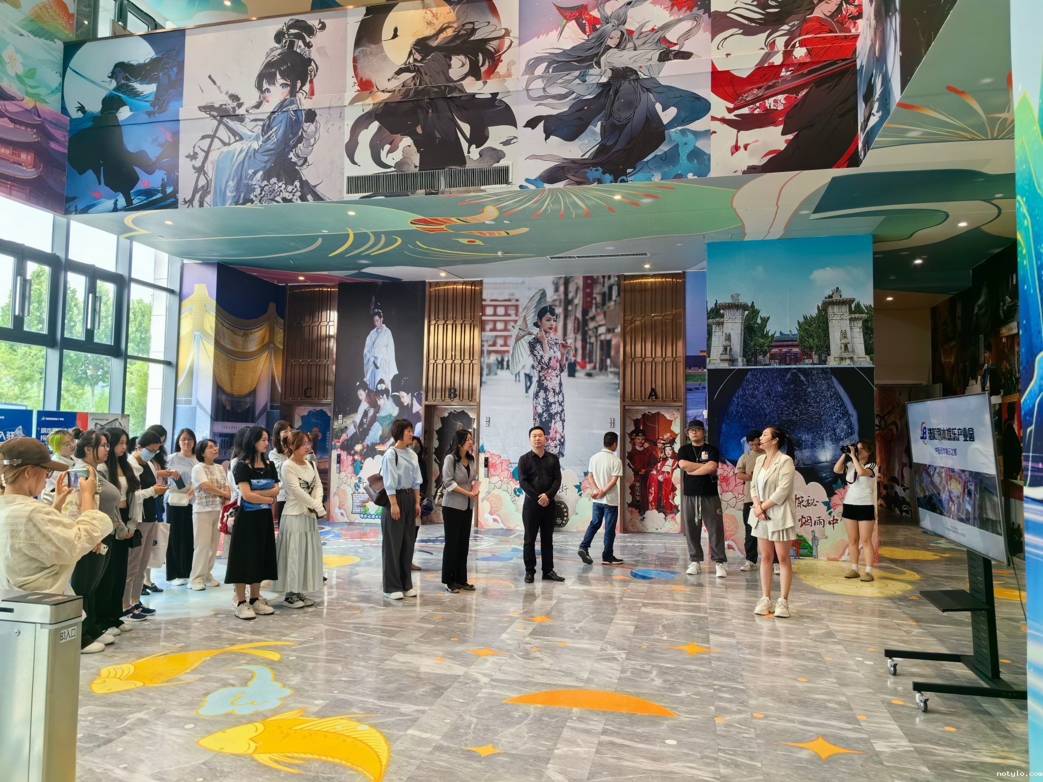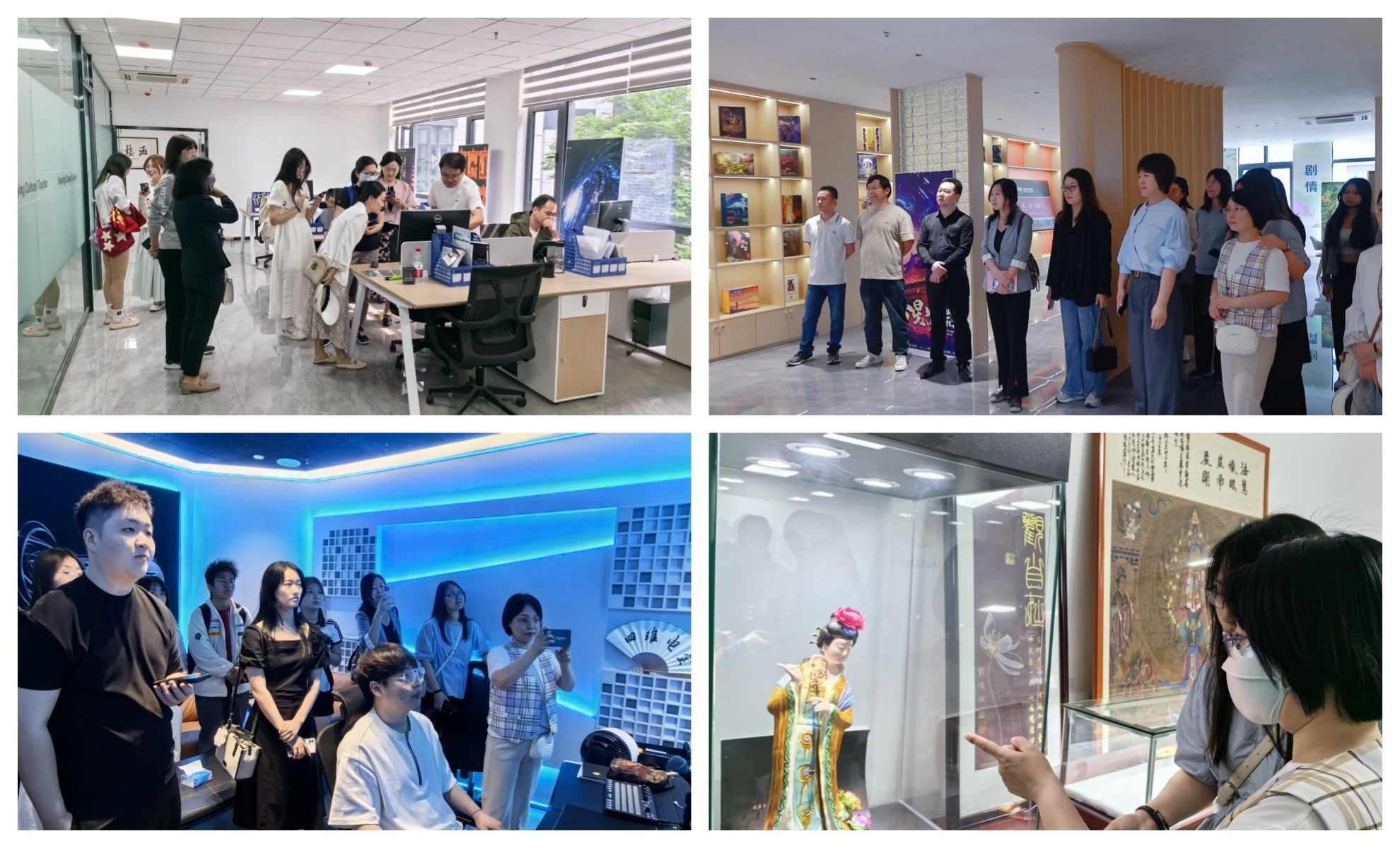 活动于早上8:30在剧本产业园正大门拉开帷幕。华邑光影(洛阳)文旅发展有限公司董事长刘志伟先生及产业园区相关企业负责人亲自陪同参观,并向师生详细介绍了产业园的运营发展状况。随后,团队参观了位于一楼大厅的园区概况展览,以及二楼展厅的进一步展示。在此期间,师生们还访问华邑文旅、德意达影视天玑文化、瞻云传媒和辐射音乐在内的多家文旅企业。